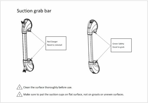 - 安裝後及每次使用前,用手搖晃扶手,測試吸盤是否牢緊吸附於牆面,如有鬆動,請重新安裝