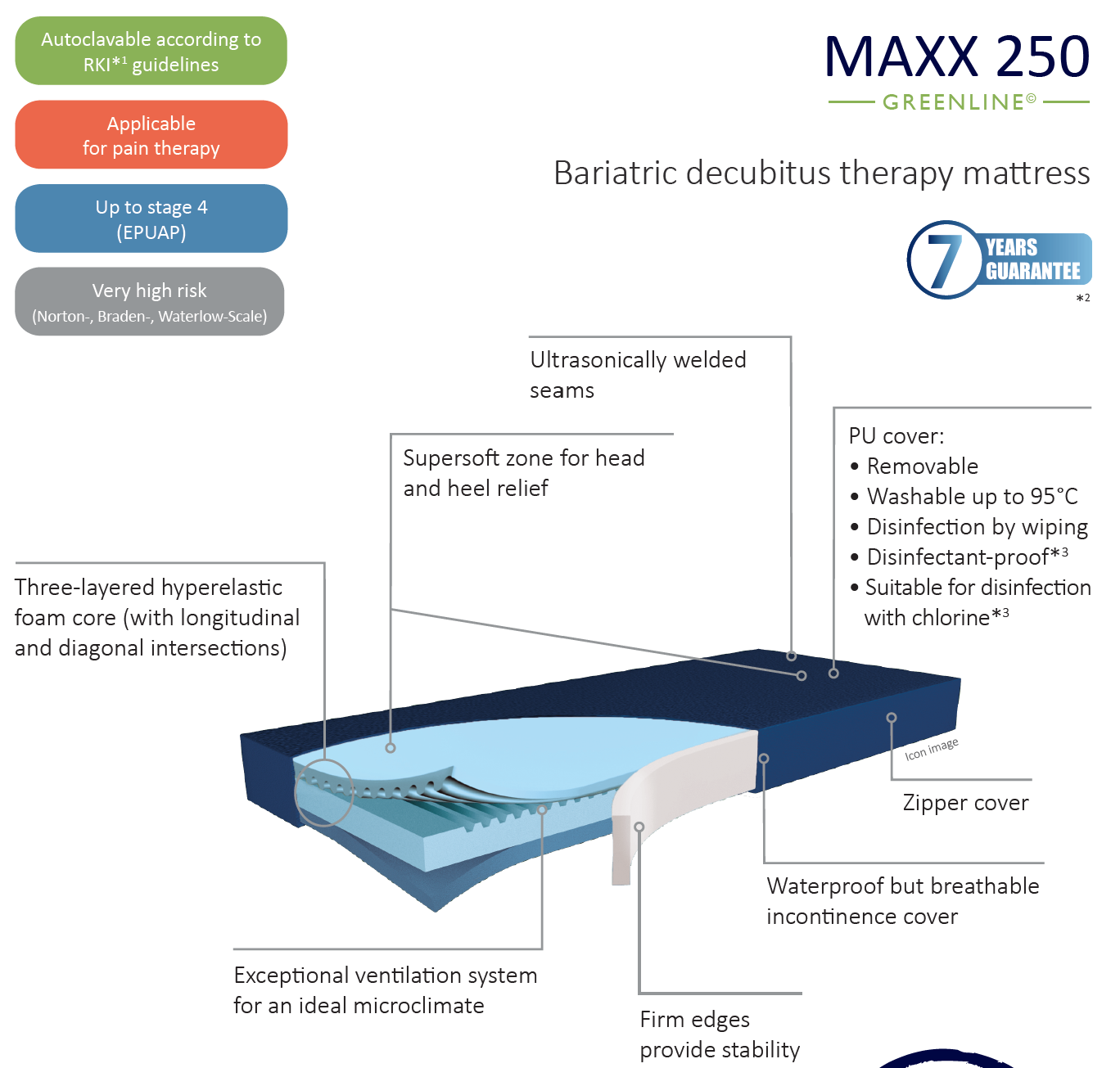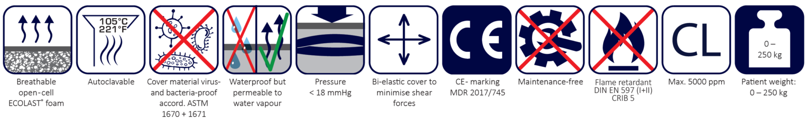 - 德國製 Ecolast® 醫療級減壓物料,為全身各受壓點 (頭、肩、手肘、腰椎、臀部、腳跟等部位) 平均分散壓力,減壓及有效預防壓瘡形成,亦能舒緩壓瘡問題