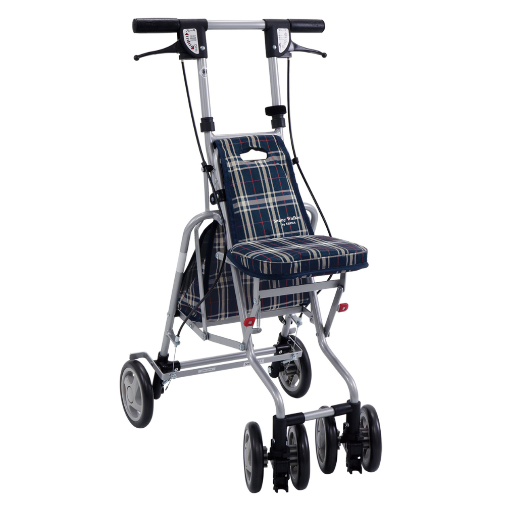 日本 Shima (島製作所) 的 Sunny Walker AW-RB (サニーウォーカー AW-RB) 是一款輕巧便攜的「緊湊型」摺合助行車。此版本為經典耐看的**「格仔NB」 (Navy Check / 格子海軍藍)** 款式,設計中性大方,男女皆宜。