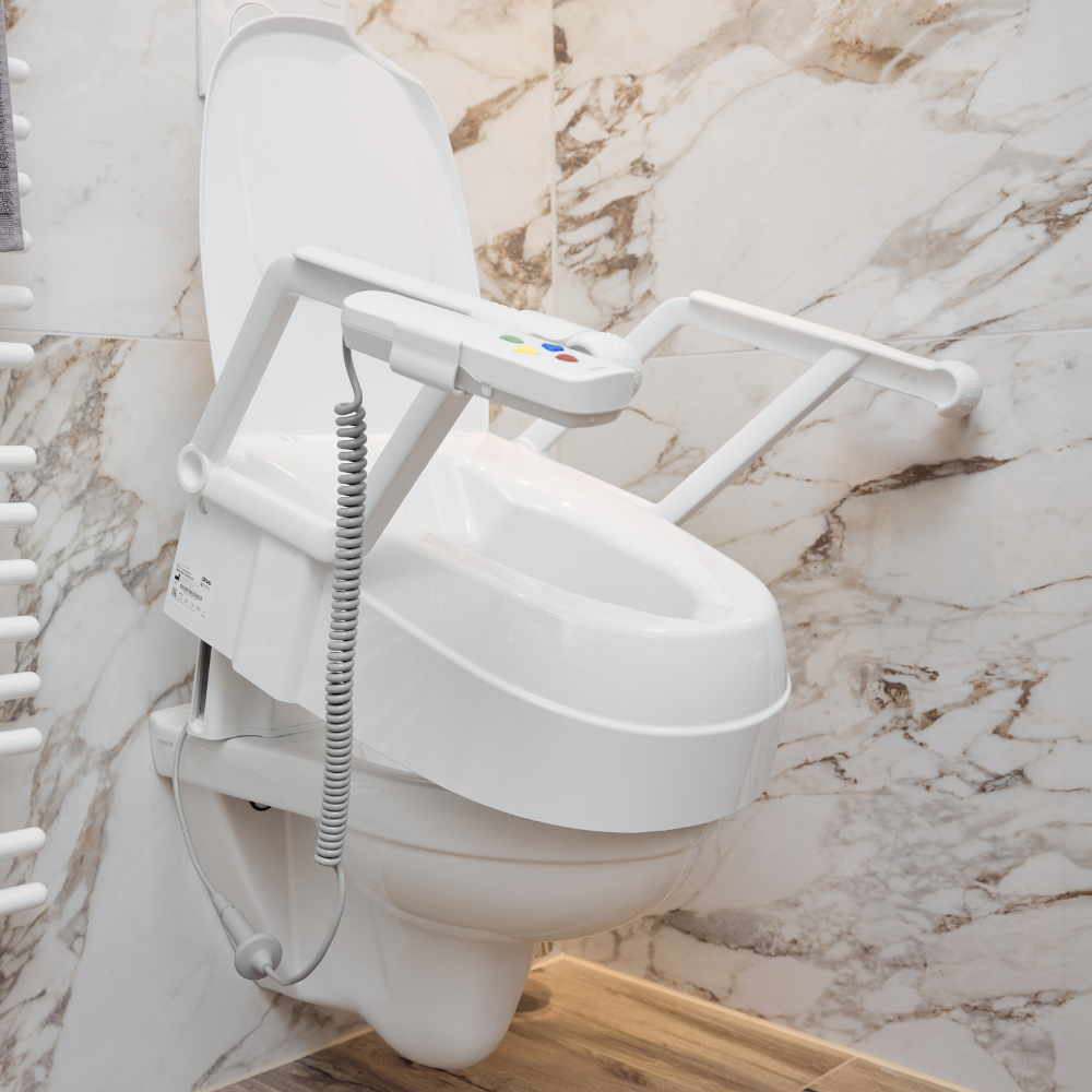 eTSE 是一款創新的電動如廁輔助裝置,專為提升使用者如廁時的獨立性與安全性而設計。它能與 Drive Medical 的 TSE 系列馬桶增高器完美結合,透過電動升降與溫和的前傾功能,協助使用者輕鬆地坐下與起身,是長者或腿部肌力不足人士的理想選擇。