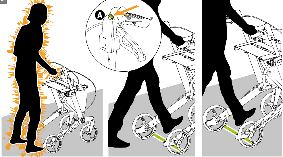 如果您「凍結」了,當您感覺腳像被黏在地上一樣,激光線可以幫助您重新啟動。使用這款特殊的助行車,您只需按下推手上的一個按鈕,即可啟動激光線。通過專注於出現在地面上的線條,您可以跨過它 – 然後重新行動