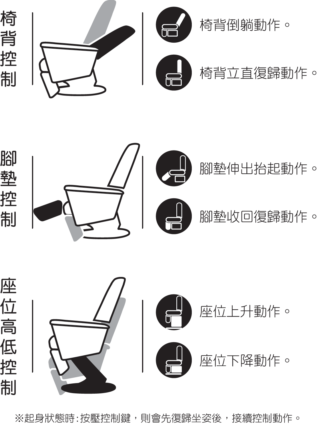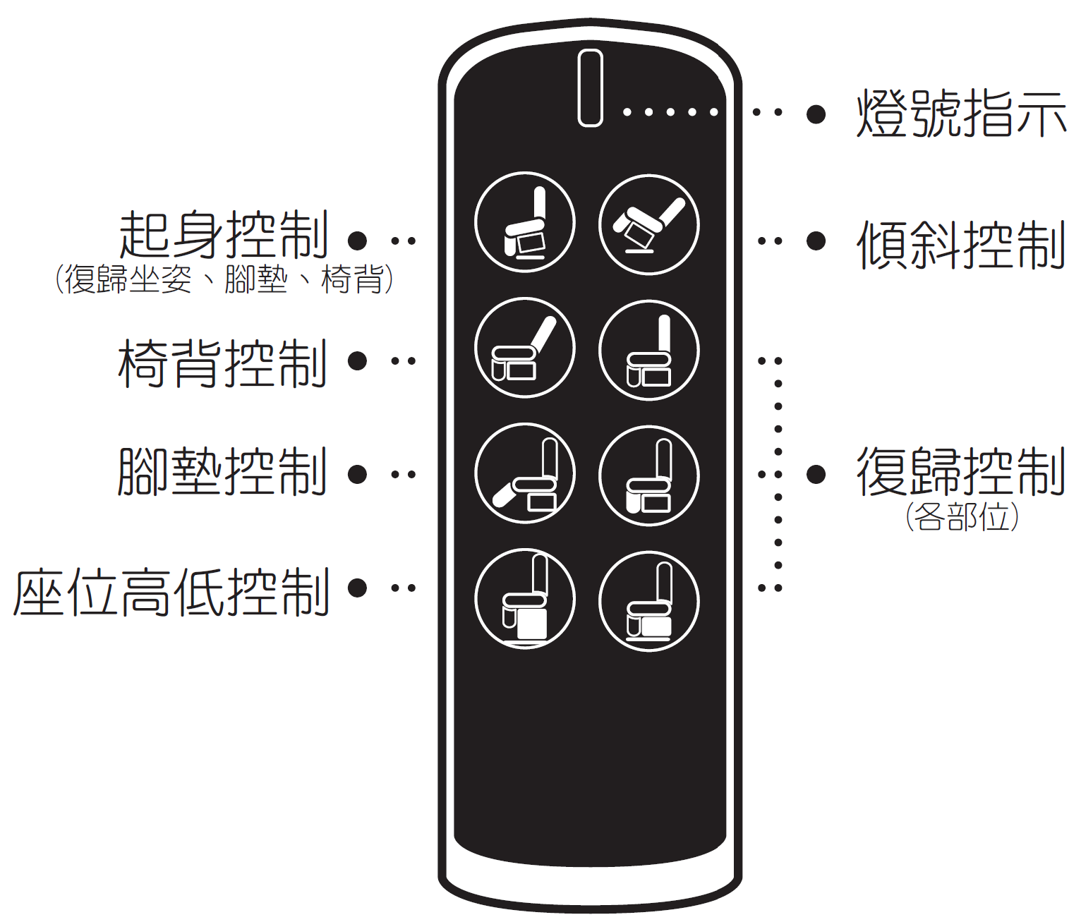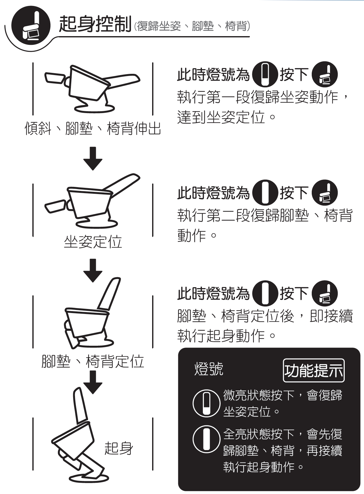 電動起身輔助可減少膝蓋施力 - 操作功能:站立、座位傾斜、背部、腳部及高低升降
