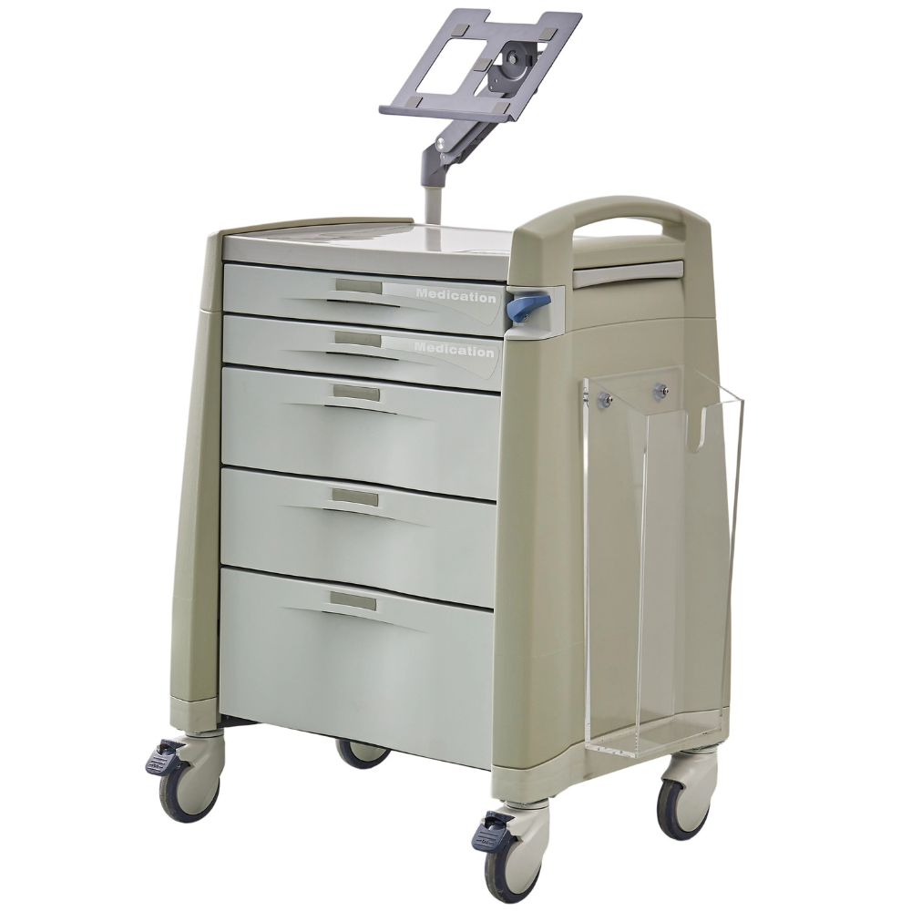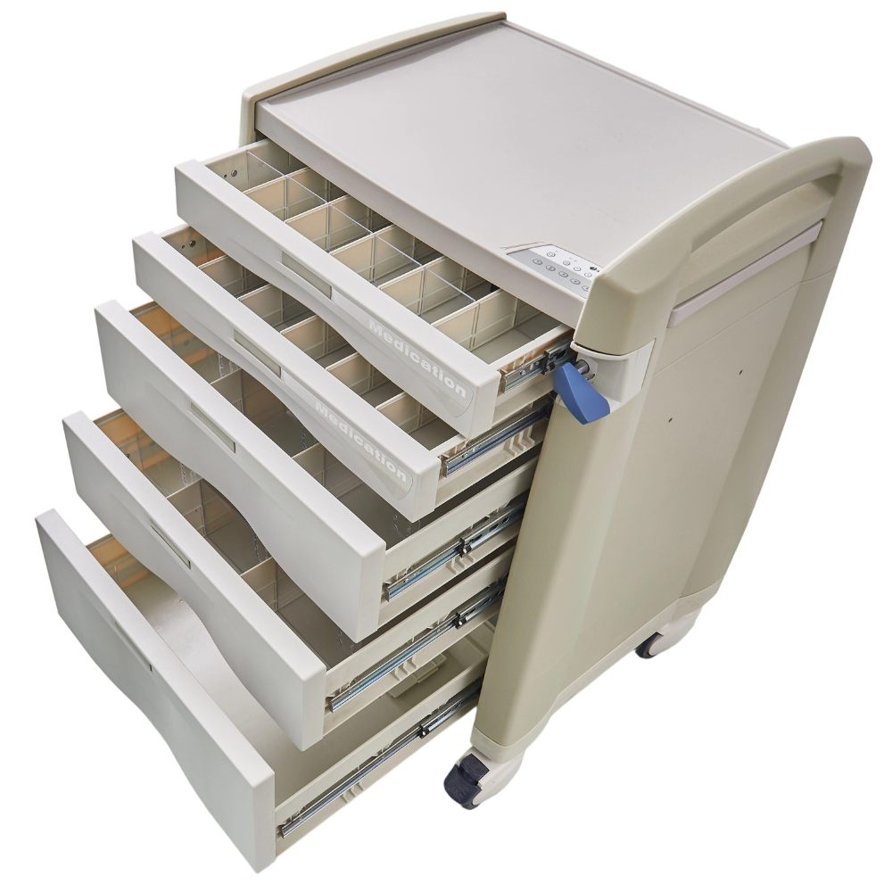專為醫院及護理機構設計,主要用於藥品分發及護理工作。採用 ABS 塑膠結合鋁合金框架,結構輕便且耐用。配備多層抽屜及靈活的內部隔板系統,方便醫護人員分類存放各類藥物及醫療耗材。