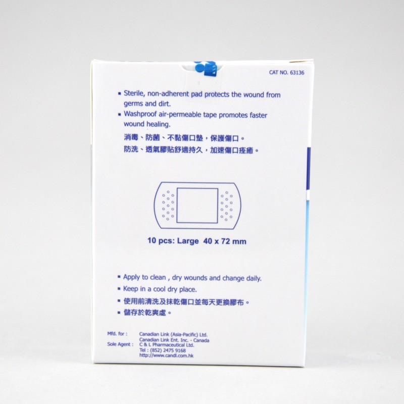 | CANC-0046 | 大片透明膠布 | 大尺寸:適合較大面積的擦傷或切割傷 | 10 片 / 盒 | CC-TPLL-10 |