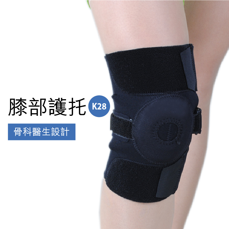 膝蓋扭傷/韌帶鬆馳/骸骨脱位/手術後康復使用及預防運動創傷 - K28 – 膝部護托﹕開放式設計,彈性布料及橢圓形髕骨海綿墊製成,用粘帶調節鬆緊大小,中間兩側有活扣和壓力粘帶可收緊髕骨及膝蓋,固定及加強膝部穩定,保護受傷之膝蓋及預防工作和運動創傷