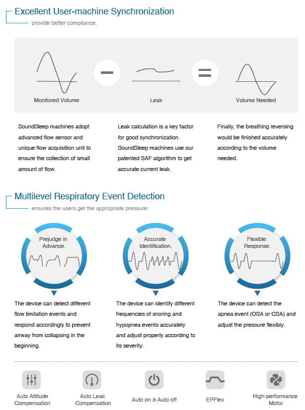 - 漏氣計算是良好同步的關鍵因素。SoundSleep 機器使用我們專利的 SAF 算法來獲取準確的當前漏氣數據